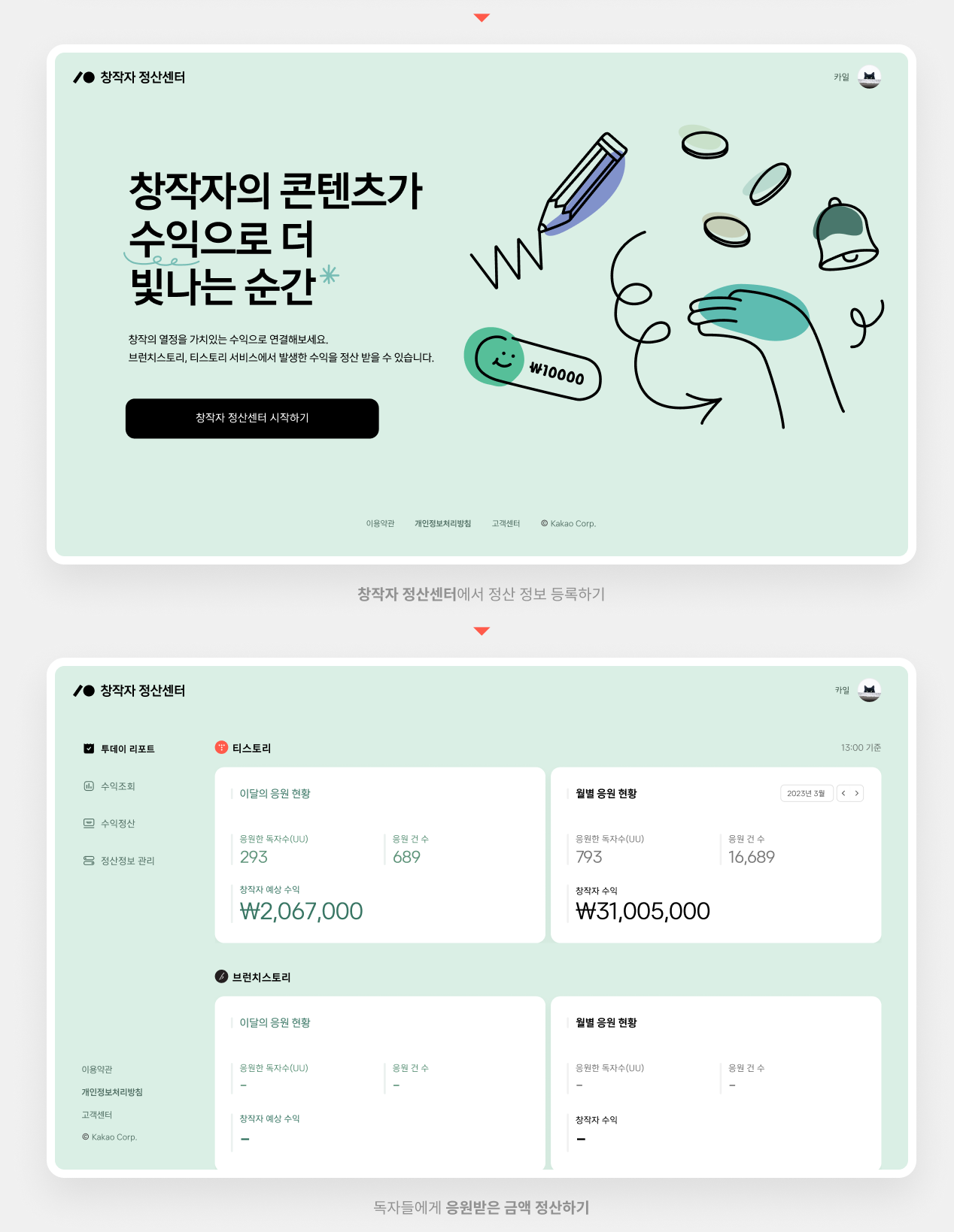 - 정산: '창작자 정산센터'를 통해 매월 15일 자동 정산