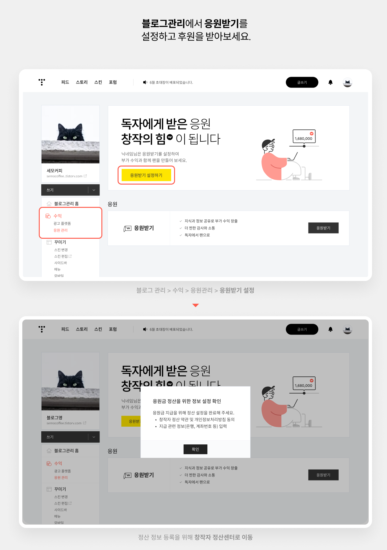 응원 정산받기 설정