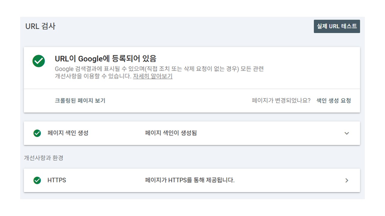 먼저 페이지에 들어가셨을 때 '검사 된 URL'이라는 표시를 확인하면 따로 확인할 필요가 없습니다. 이미 색인이 된 상태를 확인하였기 때문에 굳이 확인을 따로 할 필요가 없습니다.