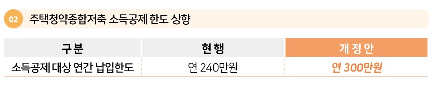 주택청약종합저축 소득공제 한도도 기존 연 240만 원에서 연 300만 원으로 상향되었기 때문에 청약통장 납입금액을 높이게 되면 소득공제를 60만 원까지 받게 됩니다.