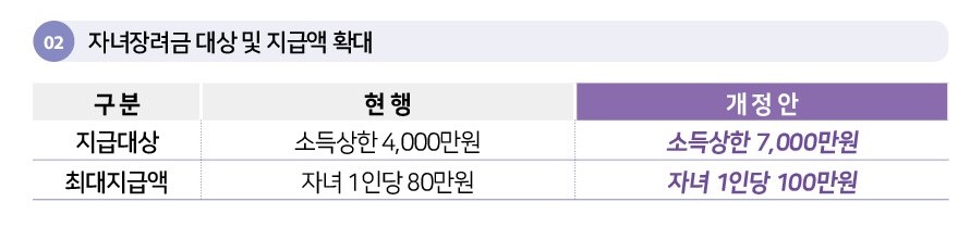 지급대상이 4천만 원에서 7천만 원으로 크게 확대되었고 지급액 역시 자녀 1인당 80만 원에서 100만 원으로 늘어났습니다.