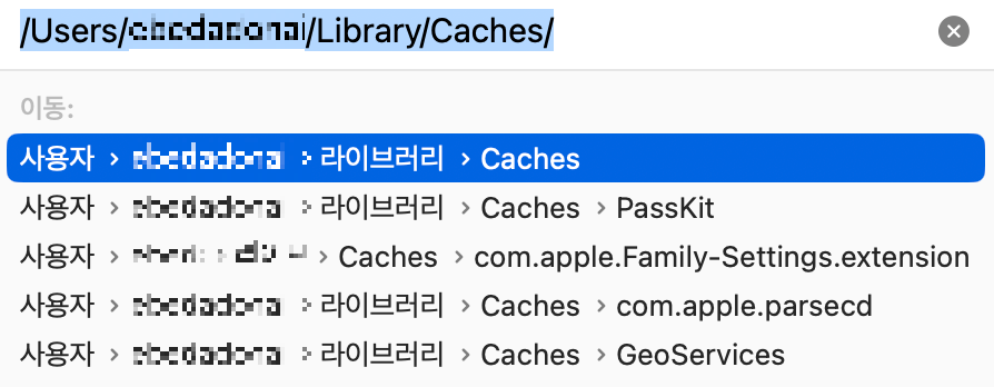 예) /User/사용자이름/라이브러리/Caches
