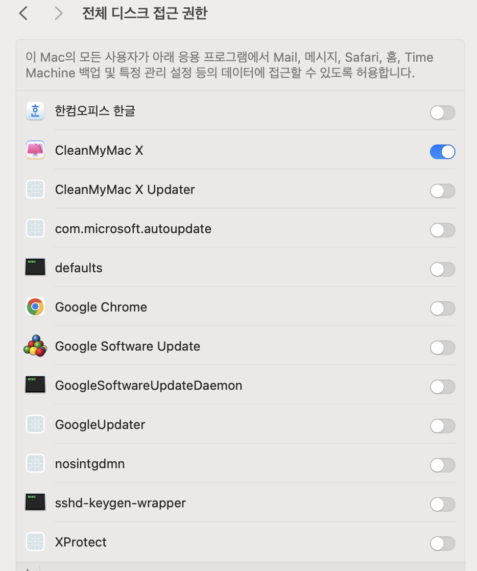 2. 전체 디스크 접근 권한 >> CleanMyMac X 허용